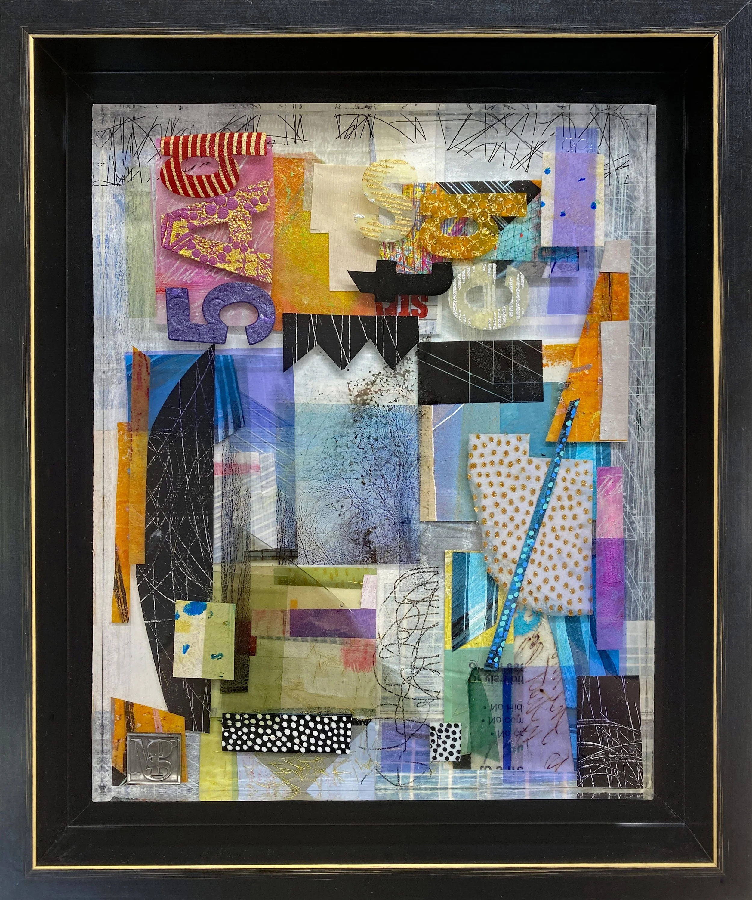 Jean’s mixed media collages convey a narrative of personal and spiritual interconnectedness. The expression of her feminine perspective continues to be an important aspect of her work. Sacred symbols appear in the richly textured surfaces, which often incorporate hand stitching, a nod to her ancestors.